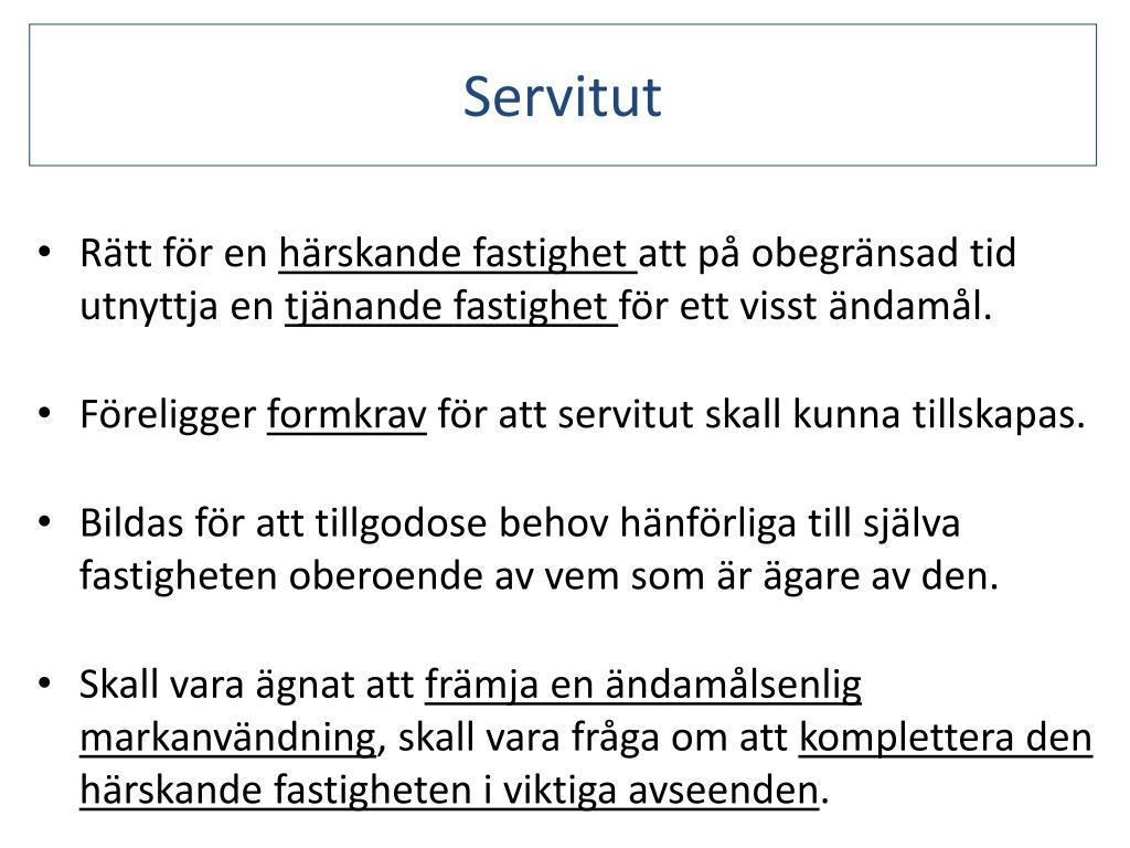 Servitut • Rättför en härskandefastighetattpåobegränsadtidutnyttja en tjänandefastighetförettvisständamål. • Föreliggerformkravförattservitutskallkunnatillskapas. • Bildasföratttillgodosebehovhänförliga till självafastighetenoberoendeavvemsomärägareav den. • Skallvaraägnatattfrämja en ändamålsenligmarkanvändning, skallvarafrågaomattkomplettera den härskandefastigheteniviktigaavseenden.