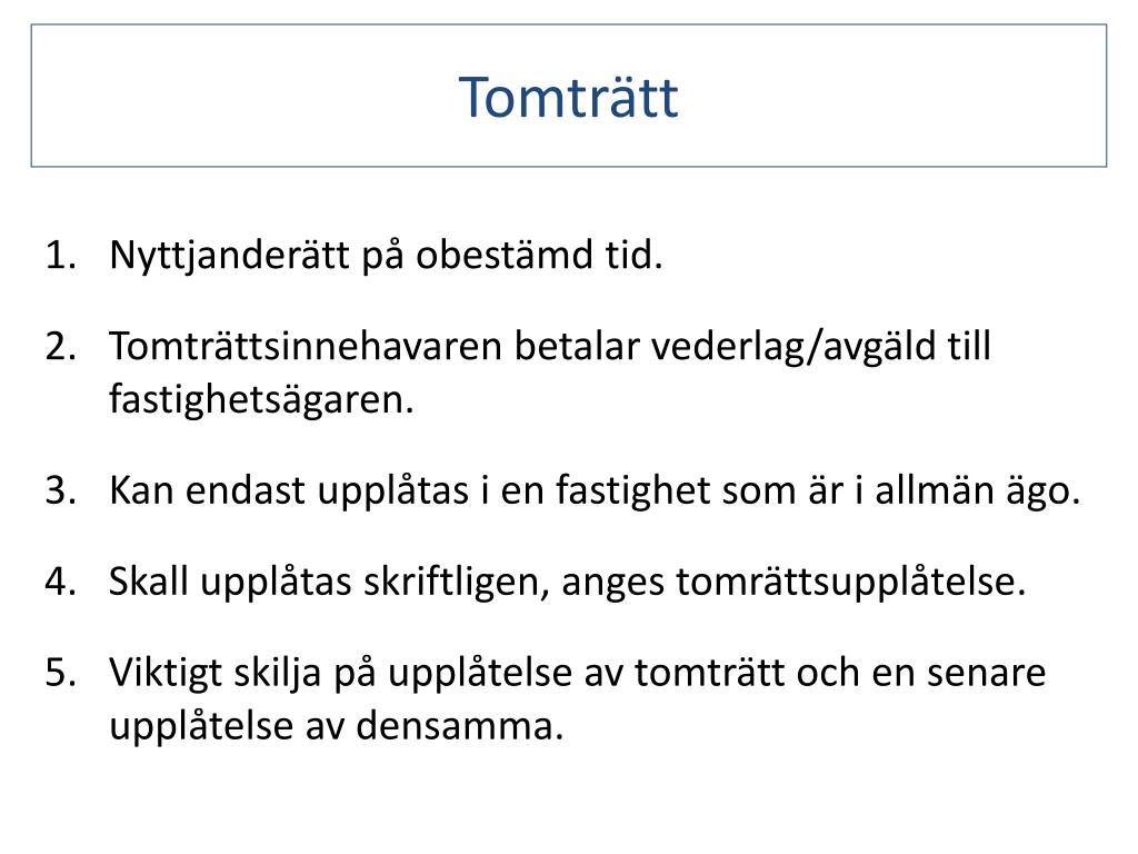 Tomträtt • Nyttjanderätt på obestämd tid. • Tomträttsinnehavaren betalar vederlag/avgäld till fastighetsägaren. • Kan endast upplåtas i en fastighet som är i allmän ägo. • Skall upplåtas skriftligen, anges tomrättsupplåtelse. • Viktigt skilja på upplåtelse av tomträtt och en senare upplåtelse av densamma.