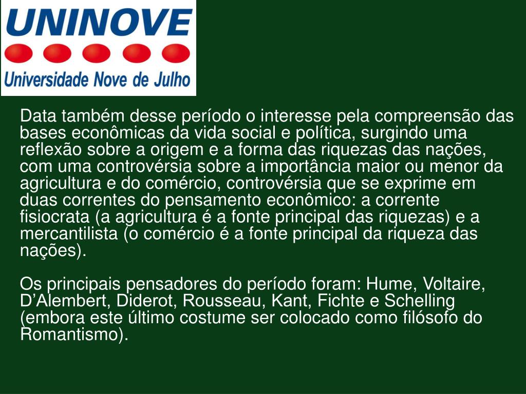 Data também desse período o interesse pela compreensão das bases econômicas da vida social e política, surgindo uma reflexão sobre a origem e a forma das riquezas das nações, com uma controvérsia sobre a importância maior ou menor da agricultura e do comércio, controvérsia que se exprime em duas correntes do pensamento econômico: a corrente fisiocrata (a agricultura é a fonte principal das riquezas) e a mercantilista (o comércio é a fonte principal da riqueza das nações). Os principais pensadores do período foram: Hume, Voltaire, D’Alembert, Diderot, Rousseau, Kant, Fichte e Schelling (embora este último costume ser colocado como filósofo do Romantismo).