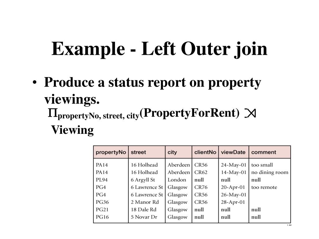 Example - Left Outer join • Produce a status report on property viewings. propertyNo, street, city(PropertyForRent) Viewing
