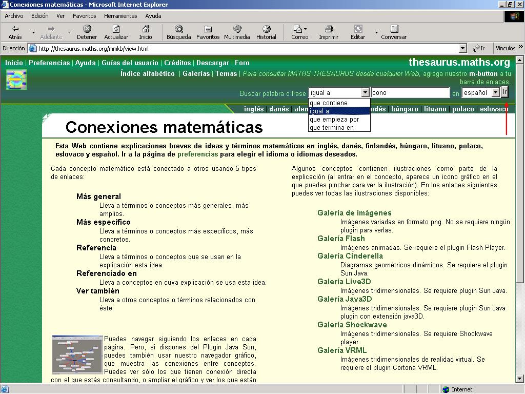 Maths Thesaurus http://thesaurus.maths.org. Base de datos multilingüe (actualmente 9 idiomas) en red de acceso libre que contiene más de 4000 conceptos Matemáticos con más de 14000 conexiones-relaciones entre ellos. La versión inglesa se desarrolla en la Universidad de Cambridge.