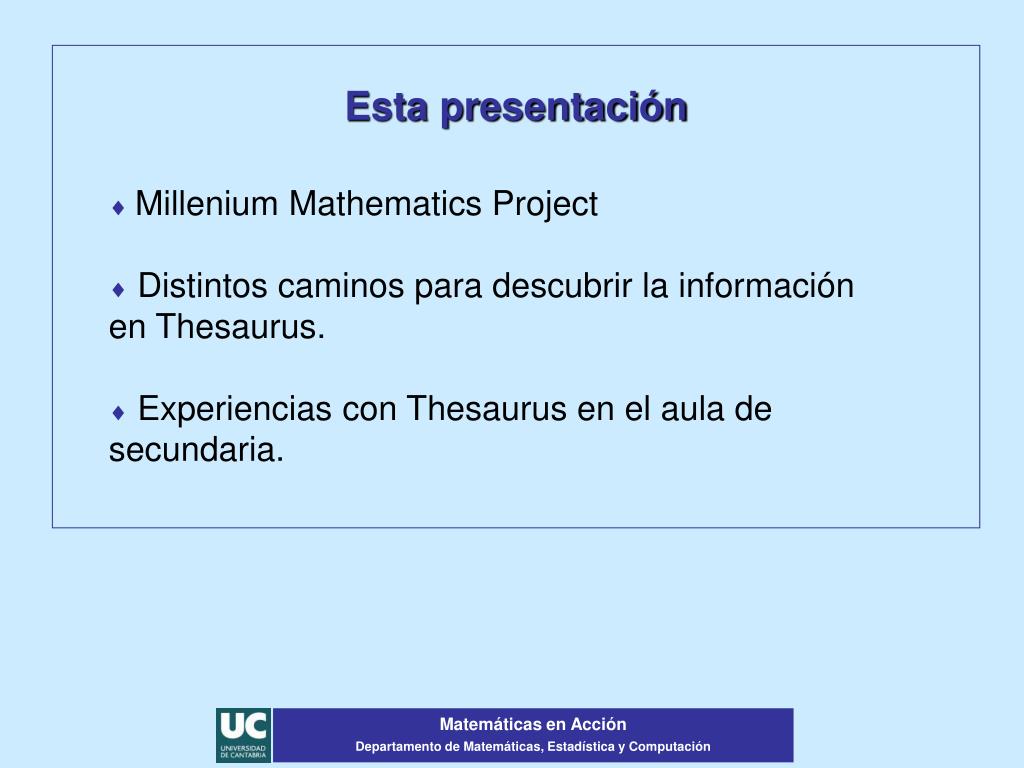 Esta presentación Millenium Mathematics Project Distintos caminos para descubrir la información en Thesaurus. Experiencias con Thesaurus en el aula de secundaria. Matemáticas en Acción Departamento de Matemáticas, Estadística y Computación