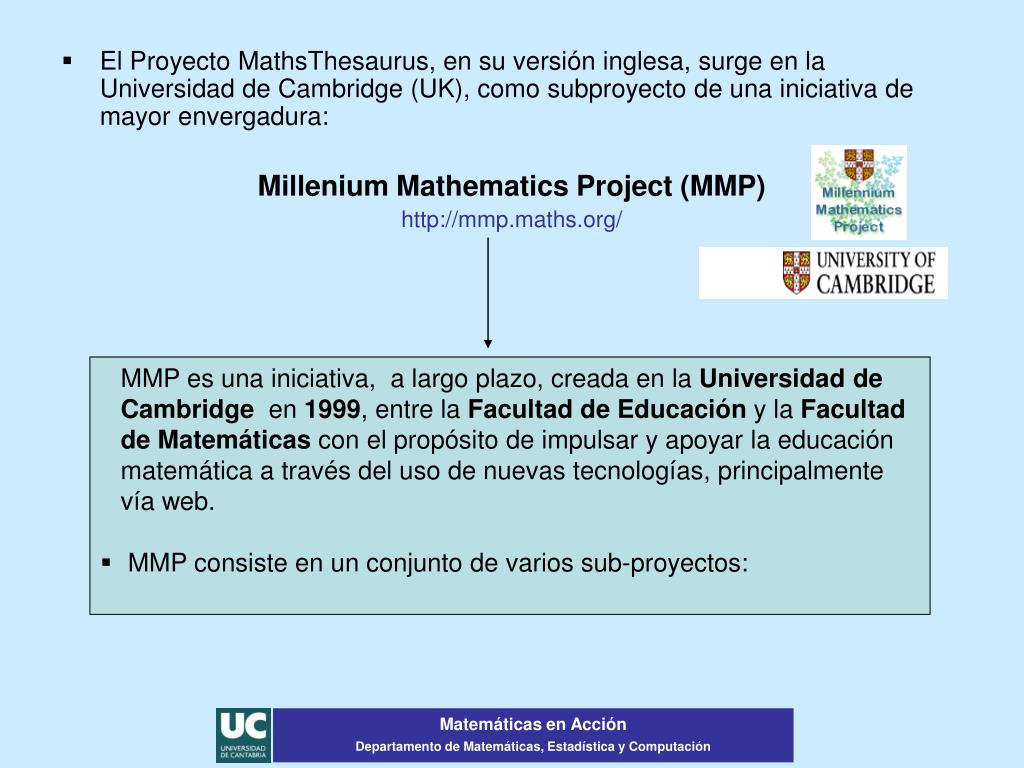MMP es una iniciativa, a largo plazo, creada en la Universidad de Cambridge en 1999, entre la Facultad de Educación y la Facultad de Matemáticas con el propósito de impulsar y apoyar la educación matemática a través del uso de nuevas tecnologías, principalmente vía web. • MMP consiste en un conjunto de varios sub-proyectos: • El Proyecto MathsThesaurus, en su versión inglesa, surge en la Universidad de Cambridge (UK), como subproyecto de una iniciativa de mayor envergadura: Millenium Mathematics Project (MMP) http://mmp.maths.org/ Matemáticas en Acción Departamento de Matemáticas, Estadística y Computación
