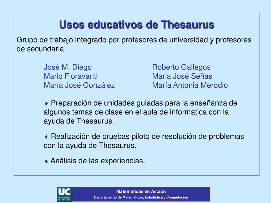Usos educativos de Thesaurus Grupo de trabajo integrado por profesores de universidad y profesores de secundaria. Preparación de unidades guiadas para la enseñanza de algunos temas de clase en el aula de informática con la ayuda de Thesaurus. Realización de pruebas piloto de resolución de problemas con la ayuda de Thesaurus. Análisis de las experiencias. José M. Diego Roberto Gallegos Mario Fioravanti Maria José Señas María José González María Antonia Merodio Matemáticas en Acción Departamento de Matemáticas, Estadística y Computación
