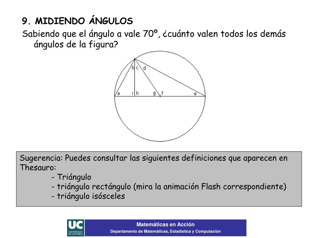 9. MIDIENDO ÁNGULOS Sabiendo que el ángulo a vale 70º, ¿cuánto valen todos los demás ángulos de la figura? Sugerencia: Puedes consultar las siguientes definiciones que aparecen en Thesauro: - Triángulo - triángulo rectángulo (mira la animación Flash correspondiente) - triángulo isósceles Matemáticas en Acción Departamento de Matemáticas, Estadística y Computación