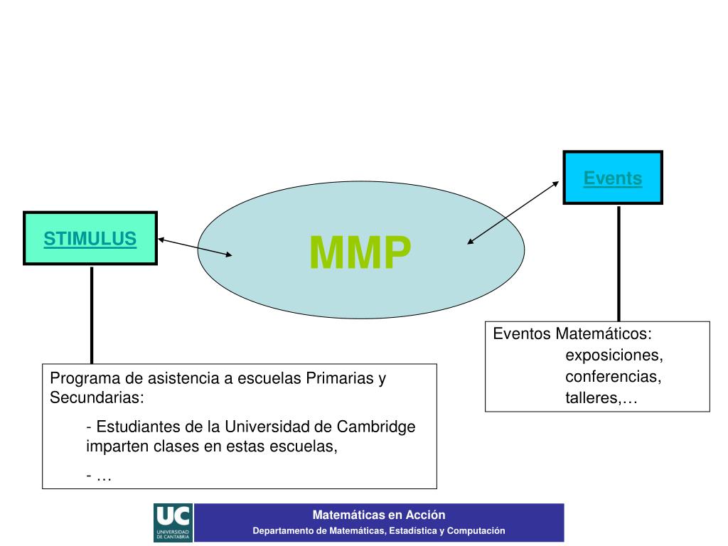 Events STIMULUS MMP Eventos Matemáticos: exposiciones, conferencias, talleres,… • Programa de asistencia a escuelas Primarias y Secundarias: • Estudiantes de la Universidad de Cambridge imparten clases en estas escuelas, • … Matemáticas en Acción Departamento de Matemáticas, Estadística y Computación
