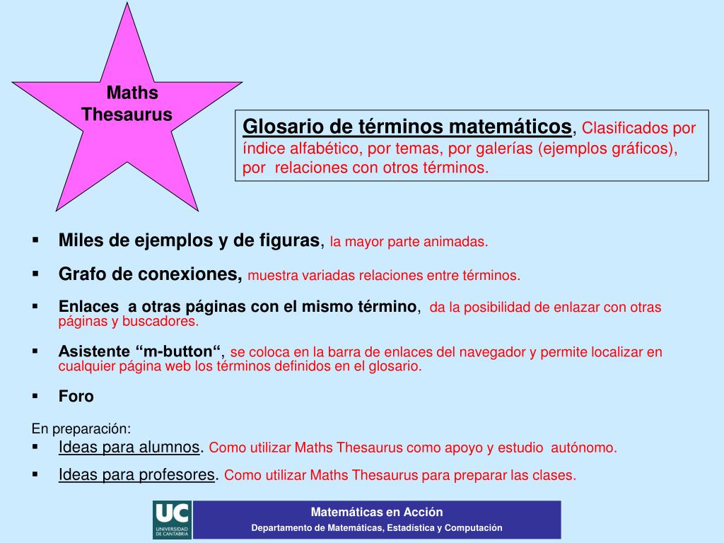 Maths Thesaurus Glosario de términos matemáticos, Clasificados por índice alfabético, por temas, por galerías (ejemplos gráficos), por relaciones con otros términos. • Miles de ejemplos y de figuras, la mayor parte animadas. • Grafo de conexiones, muestra variadas relaciones entre términos. • Enlaces a otras páginas con el mismo término, da la posibilidad de enlazar con otras páginas y buscadores. • Asistente “m-button“, se coloca en la barra de enlaces del navegador y permite localizar en cualquier página web los términos definidos en el glosario. • Foro En preparación: • Ideas para alumnos. Como utilizar Maths Thesaurus como apoyo y estudio autónomo. • Ideas para profesores. Como utilizar Maths Thesaurus para preparar las clases. Matemáticas en Acción Departamento de Matemáticas, Estadística y Computación