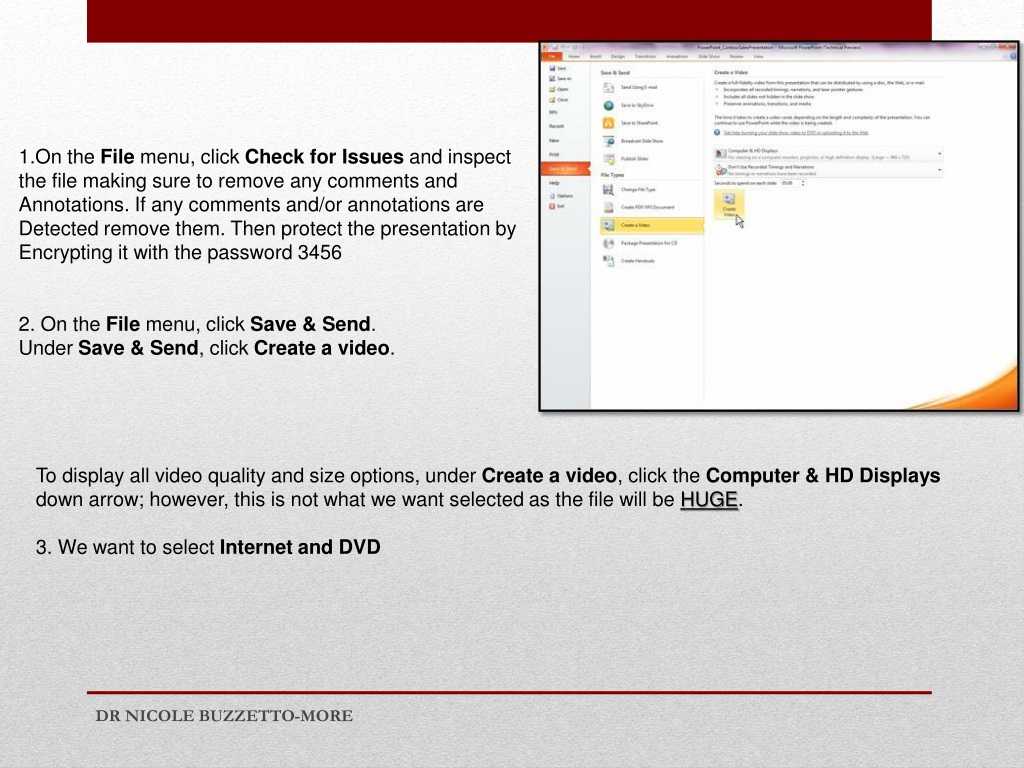 On the File menu, click Check for Issues and inspect • the file making sure to remove any comments and • Annotations. If any comments and/or annotations are • Detected remove them. Then protect the presentation by • Encrypting it with the password 3456 • 2. On the File menu, click Save & Send. • Under Save & Send, click Create a video. • To display all video quality and size options, under Create a video, click the Computer & HD Displays down arrow; however, this is not what we want selected as the file will be HUGE. • 3. We want to selectInternet and DVD DR NICOLE BUZZETTO-MORE