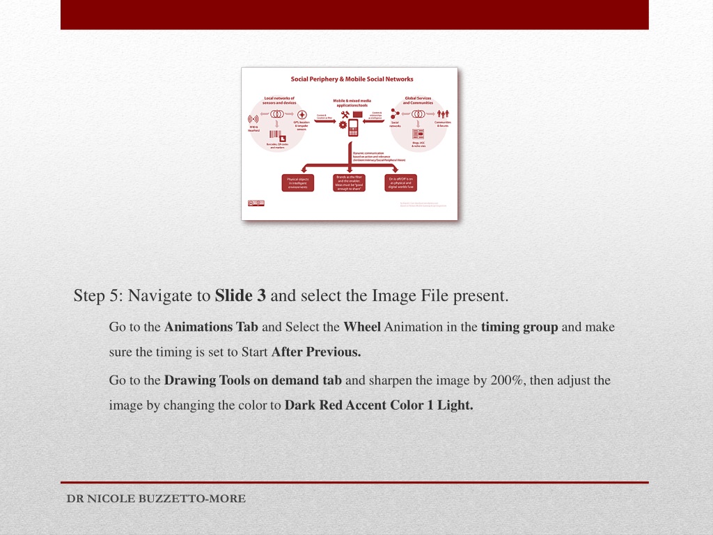 Step 5: Navigate to Slide 3 and select the Image File present. Go to the Animations Tab and Select the Wheel Animationin the timing group and make sure the timing is set to Start After Previous. Go to the Drawing Tools on demand tab and sharpen the image by 200%, then adjust the image by changing the color to Dark Red Accent Color 1 Light. DR NICOLE BUZZETTO-MORE