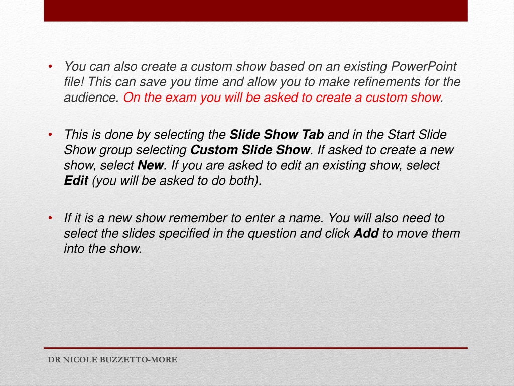 You can also create a custom show based on an existing PowerPoint file! This can save you time and allow you to make refinements for the audience. On the exam you will be asked to create a custom show. • This is done by selecting the Slide Show Tab and in the Start Slide Show group selecting Custom Slide Show. If asked to create a new show, select New. If you are asked to edit an existing show, select Edit (you will be asked to do both). • If it is a new show remember to enter a name. You will also need to select the slides specified in the question and click Add to move them into the show. DR NICOLE BUZZETTO-MORE