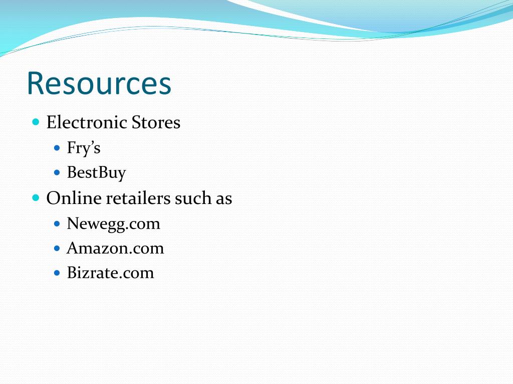 Resources • Electronic Stores • Fry’s • BestBuy • Online retailers such as • Newegg.com • Amazon.com • Bizrate.com