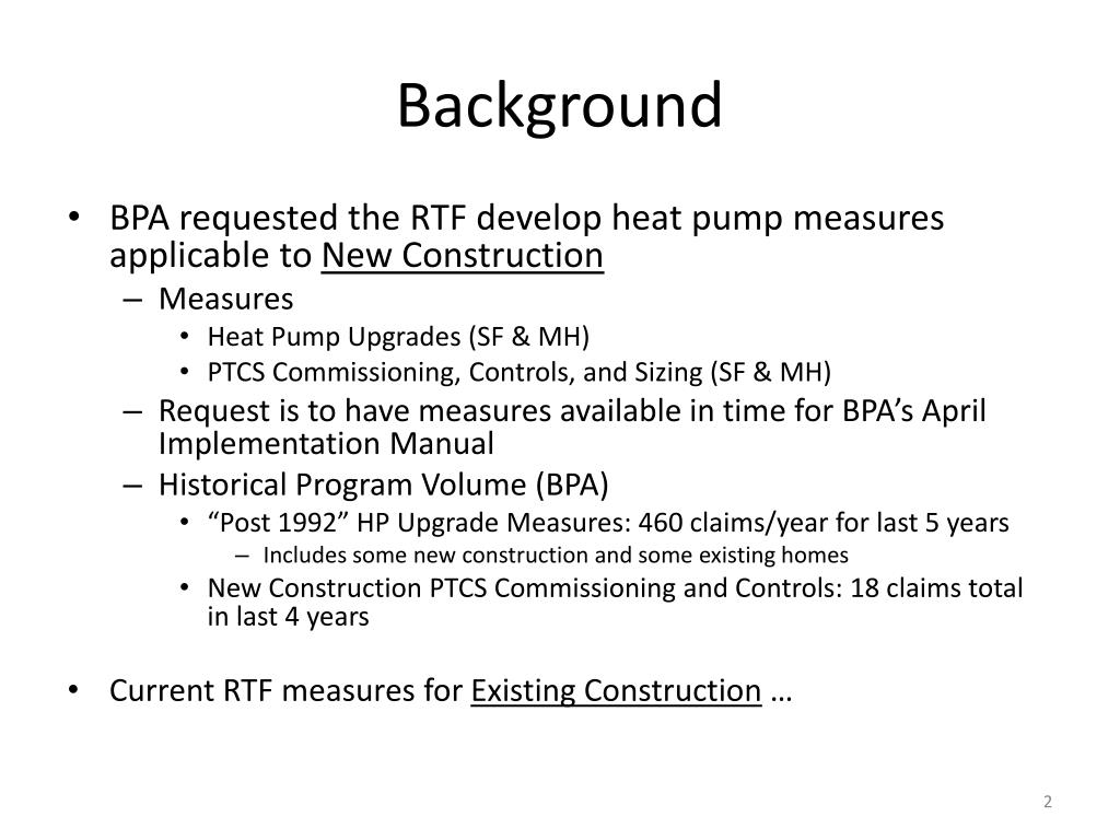 Background • BPA requested the RTF develop heat pump measures applicable to New Construction • Measures • Heat Pump Upgrades (SF & MH) • PTCS Commissioning, Controls, and Sizing (SF & MH) • Request is to have measures available in time for BPA’s April Implementation Manual • Historical Program Volume (BPA) • “Post 1992” HP Upgrade Measures: 460 claims/year for last 5 years • Includes some new construction and some existing homes • New Construction PTCS Commissioning and Controls: 18 claims total in last 4 years • Current RTF measures for Existing Construction …