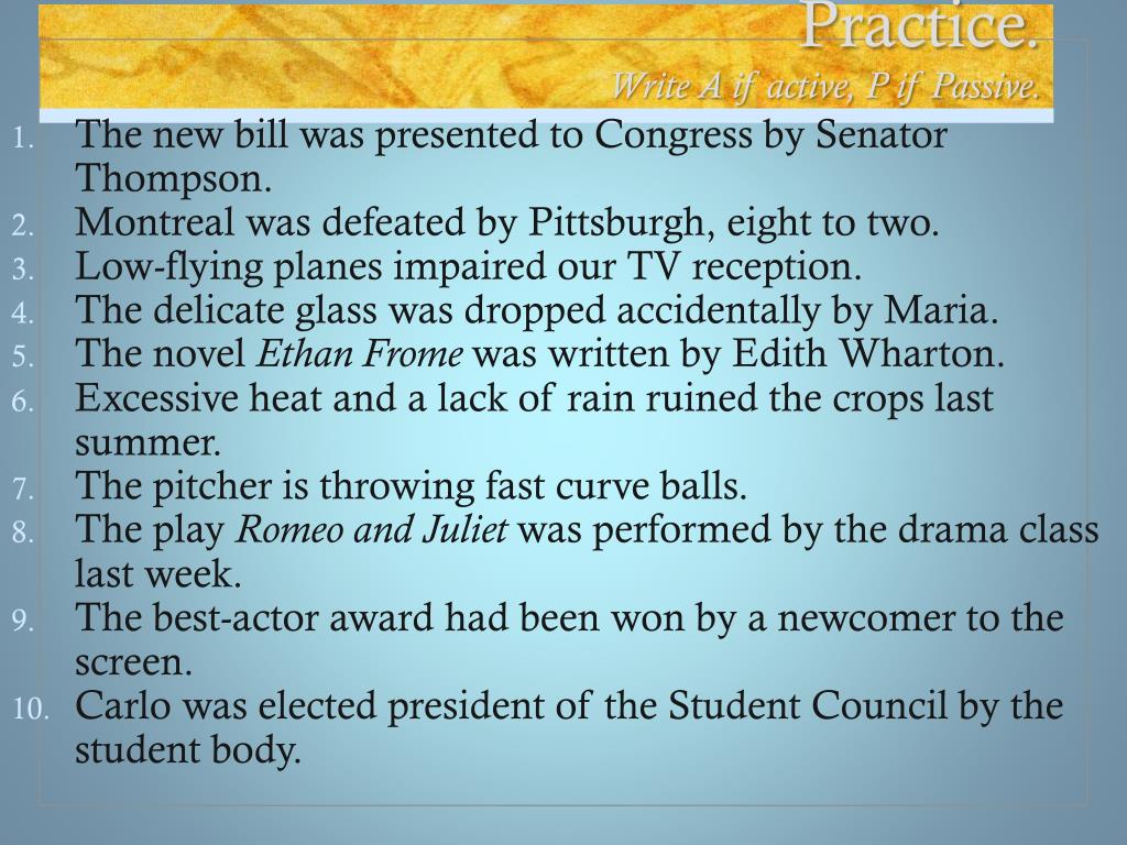 Practice.Write A if active, P if Passive. • The new bill was presented to Congress by Senator Thompson. • Montreal was defeated by Pittsburgh, eight to two. • Low-flying planes impaired our TV reception. • The delicate glass was dropped accidentally by Maria. • The novel Ethan Frome was written by Edith Wharton. • Excessive heat and a lack of rain ruined the crops last summer. • The pitcher is throwing fast curve balls. • The play Romeo and Juliet was performed by the drama class last week. • The best-actor award had been won by a newcomer to the screen. • Carlo was elected president of the Student Council by the student body.