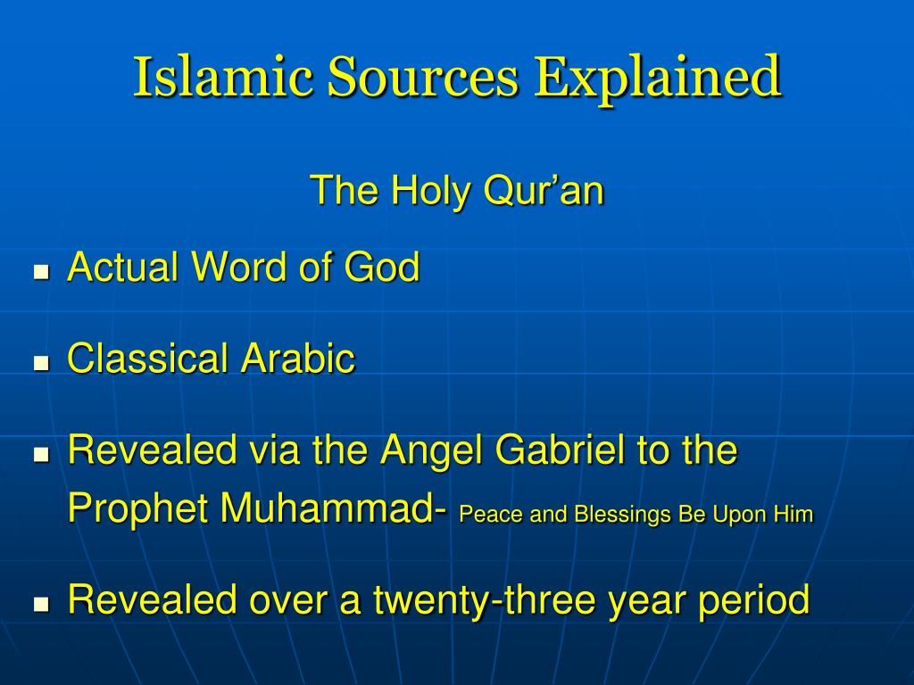 Islamic Sources Explained The Holy Qur’an • Actual Word of God • Classical Arabic • Revealed via the Angel Gabriel to the Prophet Muhammad- Peace and Blessings Be Upon Him • Revealed over a twenty-three year period