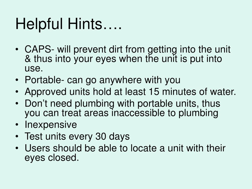 Helpful Hints…. • CAPS- will prevent dirt from getting into the unit & thus into your eyes when the unit is put into use. • Portable- can go anywhere with you • Approved units hold at least 15 minutes of water. • Don’t need plumbing with portable units, thus you can treat areas inaccessible to plumbing • Inexpensive • Test units every 30 days • Users should be able to locate a unit with their eyes closed.
