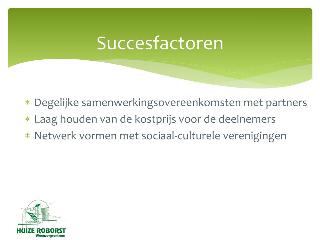 Succesfactoren Degelijke samenwerkingsovereenkomsten met partners Laag houden van de kostprijs voor de deelnemers Netwerk vormen met sociaal-culturele verenigingen