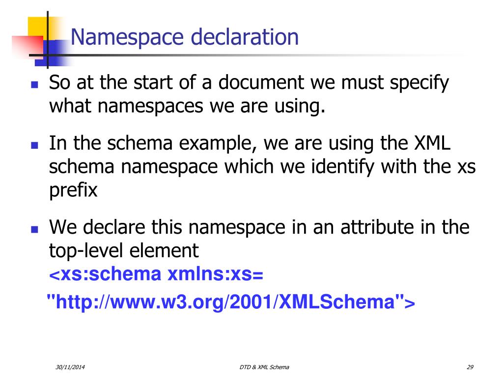 Namespace declaration • So at the start of a document we must specify what namespaces we are using. • In the schema example, we are using the XML schema namespace which we identify with the xs prefix • We declare this namespace in an attribute in the top-level element<xs:schema xmlns:xs= "http://www.w3.org/2001/XMLSchema"> DTD & XML Schema