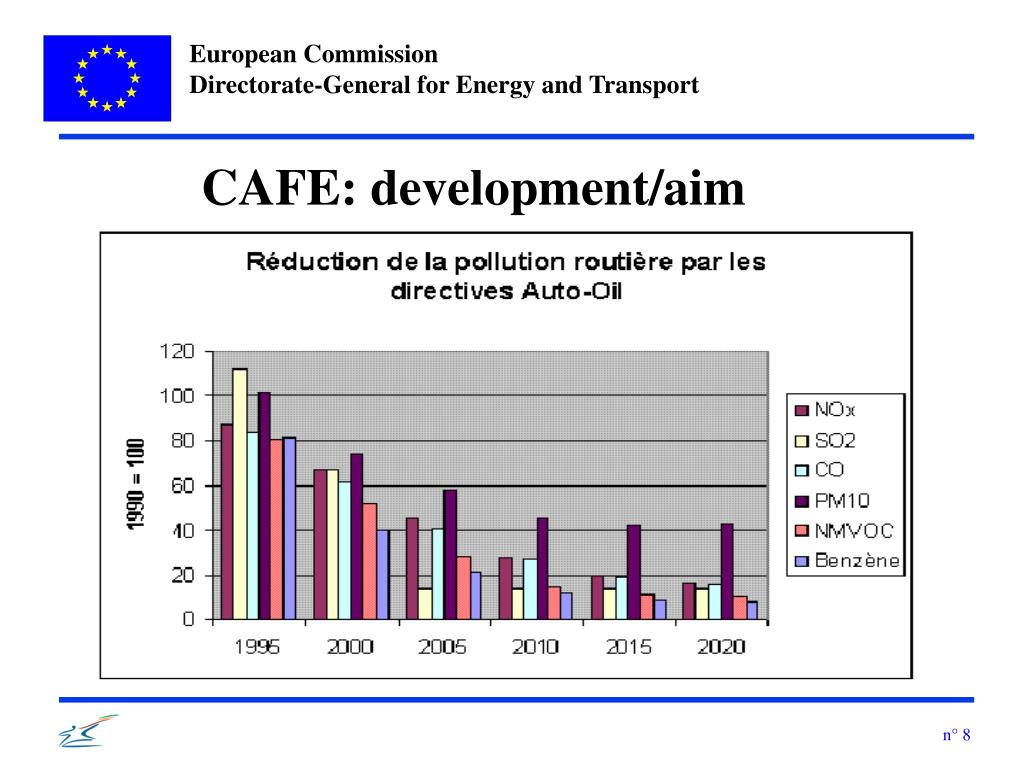CAFE • CAFE: Programme launched in 2001 • Approach: knowledge- and cost-effective based, focus on stakeholders consultation • Scope: wider than Auto-Oil and open to all industry sectors: transport & heating and industry processes etc.