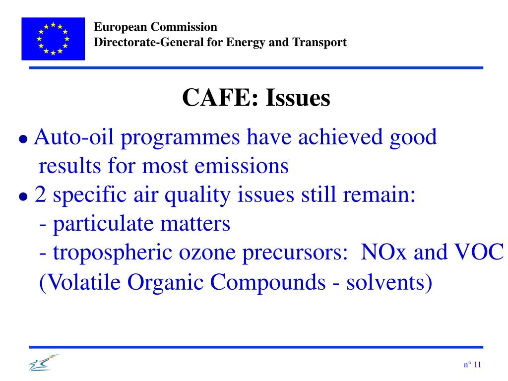CAFE: Issues • Auto-oil programmes have achieved good results for most emissions • 2 specific air quality issues still remain: - particulate matters - tropospheric ozone precursors: NOx and VOC (Volatile Organic Compounds - solvents)