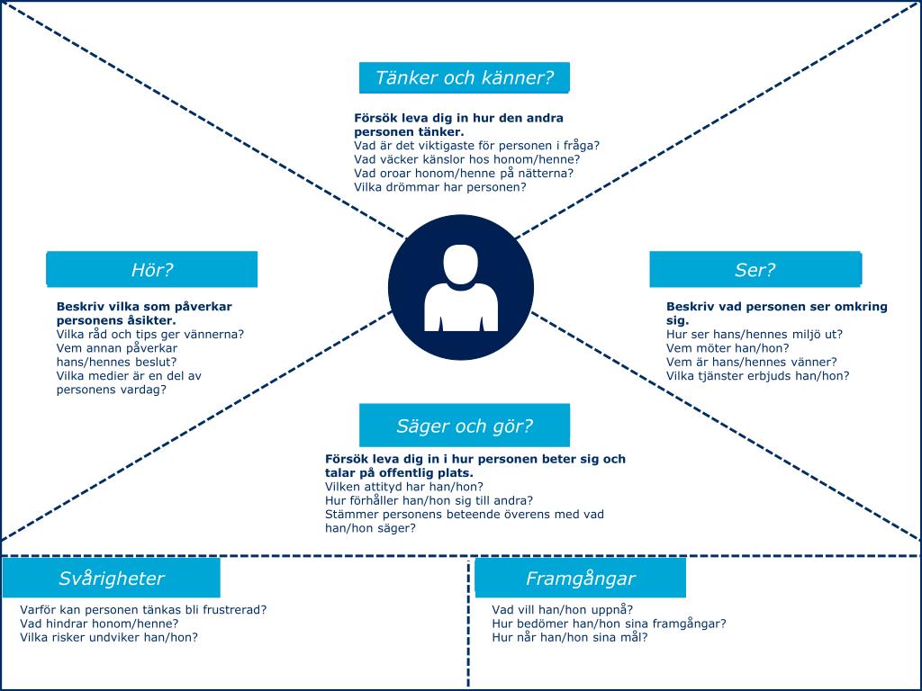 Tänker och känner? Försöklevadig in hurdenandrapersonentänker. Vadär det viktigaste för personen i fråga? Vadväckerkänslorhoshonom/henne? Vadoroarhonom/hennepånätterna? Vilkadrömmarharpersonen? Hör? Ser? Beskrivvilkasompåverkarpersonensåsikter. Vilkaråd och tipsgervännerna? Vem annan påverkarhans/hennesbeslut? Vilkamedierär en del av personensvardag? Beskrivvadpersonenseromkringsig. Hurserhans/hennesmiljöut? Vemmöterhan/hon? Vemärhans/hennesvänner? Vilkatjänstererbjudshan/hon? Säger och gör? Försöklevadig in i hurpersonenbetersig och talarpåoffentligplats. Vilkenattitydharhan/hon? Hurförhållerhan/honsigtillandra? Stämmerpersonensbeteendeöverensmedvadhan/honsäger? Svårigheter Framgångar Varförkanpersonentänkasblifrustrerad? Vadhindrarhonom/henne? Vilkariskerundvikerhan/hon? Vadvillhan/honuppnå? Hurbedömerhan/honsinaframgångar? Hurnårhan/honsinamål?