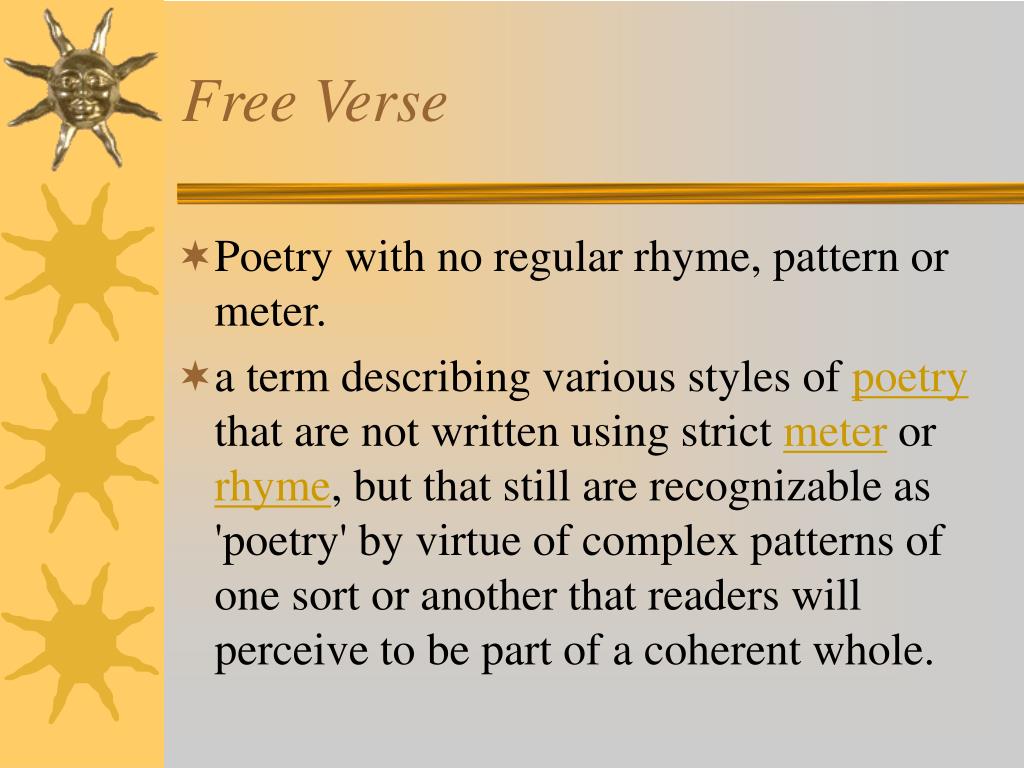 Free Verse • Poetry with no regular rhyme, pattern or meter. • a term describing various styles of poetry that are not written using strict meter or rhyme, but that still are recognizable as 'poetry' by virtue of complex patterns of one sort or another that readers will perceive to be part of a coherent whole.
