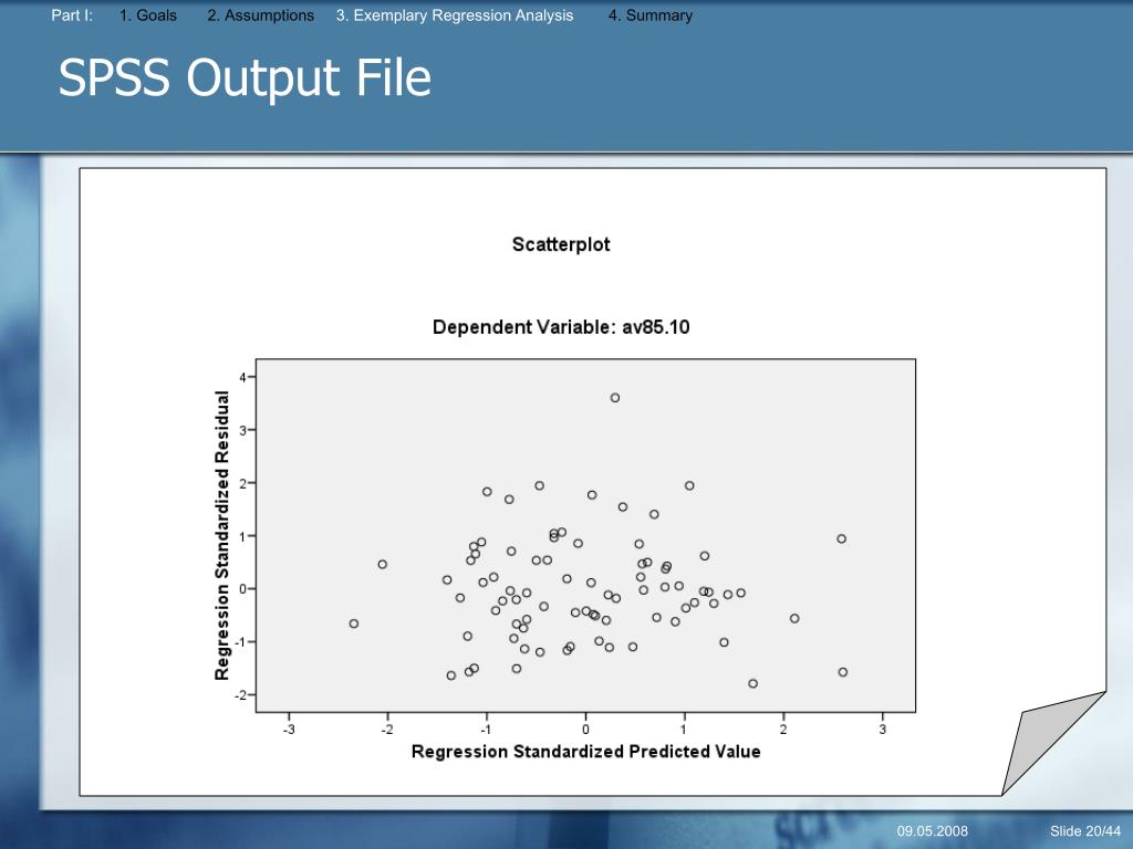 Part I: 1. Goals2. Assumptions 3. Exemplary Regression Analysis 4. Summary SPSS Output File 09.05.2008 Slide 20/44