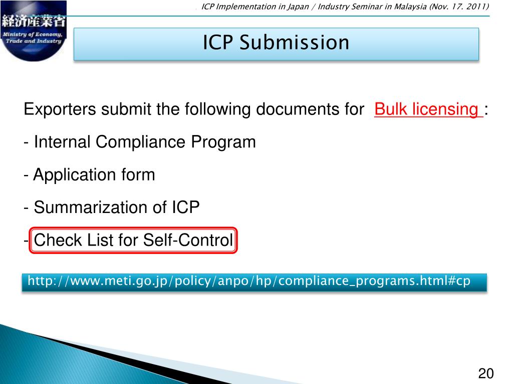 ICP Submission Exporters submit the following documents for Bulk licensing : • Internal Compliance Program • Application form • Summarization of ICP • Check List for Self-Control http://www.meti.go.jp/policy/anpo/hp/compliance_programs.html#cp