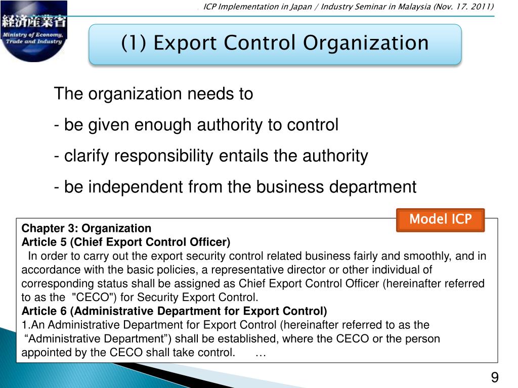 (1) Export Control Organization • The organization needs to • be given enough authority to control • clarify responsibility entails the authority • be independent from the business department Model ICP • Chapter 3: Organization • Article 5 (Chief Export Control Officer) • In order to carry out the export security control related business fairly and smoothly, and in accordance with the basic policies, a representative director or other individual of corresponding status shall be assigned as Chief Export Control Officer (hereinafter referred • to as the "CECO") for Security Export Control. • Article 6 (Administrative Department for Export Control) • An Administrative Department for Export Control (hereinafter referred to as the • “Administrative Department”) shall be established, where the CECO or the person appointed by the CECO shall take control.…