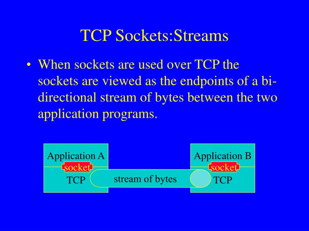 TCP Sockets:Streams • When sockets are used over TCP the sockets are viewed as the endpoints of a bi-directional stream of bytes between the two application programs. stream of bytes Application A Application B socket socket TCP TCP