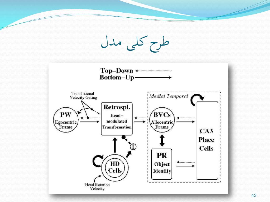 مدل Rolls • شبیه سازی یادگیری رقابتی در DG برای تشکیل میدان مکانی سلول های مکانی از فعالیت سلول های شبکه EC. • محیط در نظر گرفته شده برای تعلیم و تست یک فضای 100x100 است. • در مدل تعداد 125 سلول شبکه در نظر گرفته شده که شامل فرکانس های 3 تا 7 سیکل بوده و برای هر فرکانس 25 افست مختلف در نظر گرفته شده است. • تعداد سلول های DG در مدل برابر 100 است. • نتایج مدل نشان می دهد که چگونه فعالیت سلول های مکانی DG می تواند از سلول های شبکه در EC حاصل گردد.