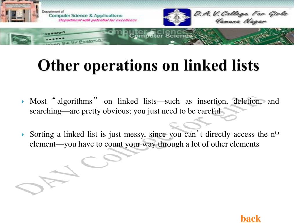 Other operations on linked lists • Most “algorithms” on linked lists—such as insertion, deletion, and searching—are pretty obvious; you just need to be careful • Sorting a linked list is just messy, since you can’t directly access the nth element—you have to count your way through a lot of other elements back