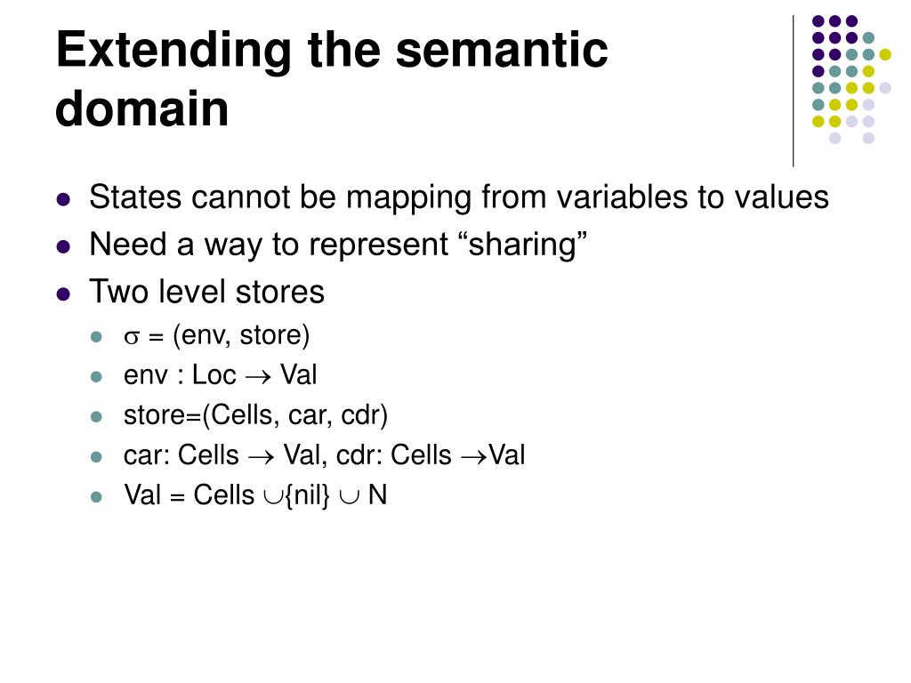 Extending the semantic domain • States cannot be mapping from variables to values • Need a way to represent “sharing” • Two level stores • = (env, store) • env : Loc Val • store=(Cells, car, cdr) • car: Cells Val, cdr: Cells Val • Val = Cells {nil} N