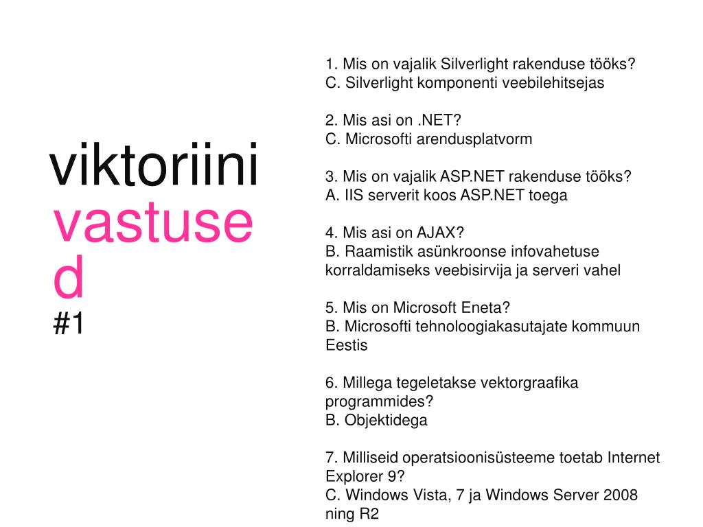 1. Mis on vajalik Silverlight rakenduse tööks? • C. Silverlight komponenti veebilehitsejas • 2. Mis asi on .NET? • C. Microsofti arendusplatvorm • 3. Mis on vajalik ASP.NET rakenduse tööks? • A. IIS serverit koos ASP.NET toega • 4. Mis asi on AJAX? • B. Raamistik asünkroonse infovahetuse korraldamiseks veebisirvija ja serveri vahel • 5. Mis on Microsoft Eneta? • B. Microsofti tehnoloogiakasutajate kommuun Eestis • 6. Millega tegeletakse vektorgraafika programmides? • B. Objektidega • 7. Milliseid operatsioonisüsteeme toetab Internet Explorer 9? • C. Windows Vista, 7 ja Windows Server 2008 ning R2 viktoriinivastused#1