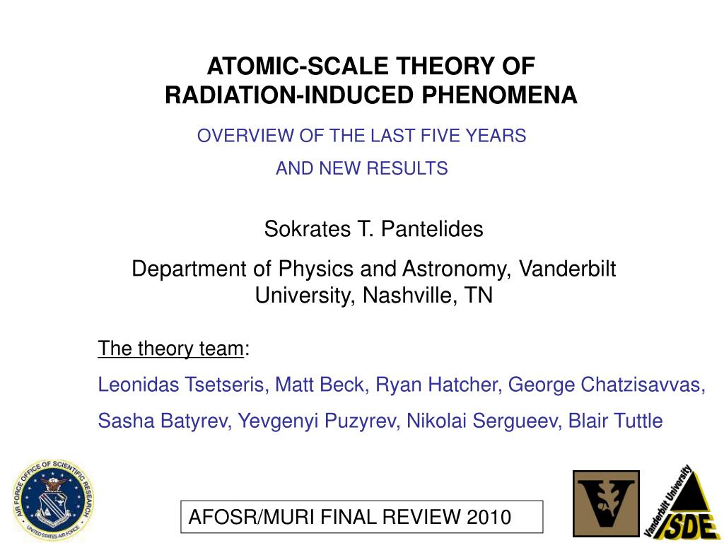 ATOMIC-SCALE THEORY OF RADIATION-INDUCED PHENOMENA OVERVIEW OF THE LAST FIVE YEARS AND NEW RESULTS Sokrates T. Pantelides Department of Physics and Astronomy, Vanderbilt University, Nashville, TN The theory team: Leonidas Tsetseris, Matt Beck, Ryan Hatcher, George Chatzisavvas, Sasha Batyrev, Yevgenyi Puzyrev, Nikolai Sergueev, Blair Tuttle AFOSR/MURI FINAL REVIEW 2010