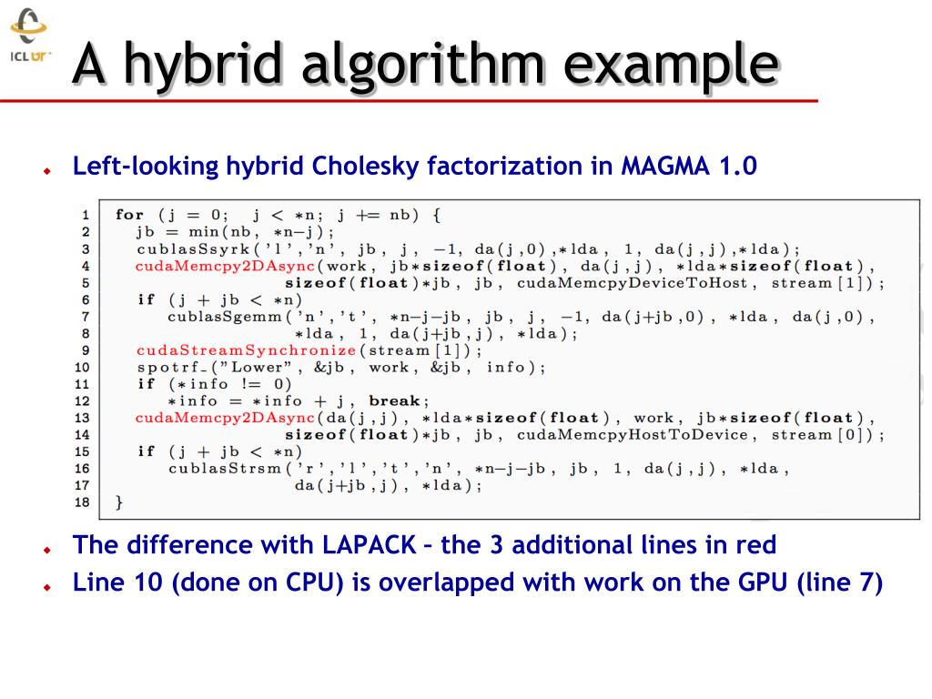 A hybrid algorithm example • Left-looking hybrid Cholesky factorization in MAGMA 1.0 • The difference with LAPACK – the 3 additional lines in red • Line 10 (done on CPU) is overlapped with work on the GPU (line 7)