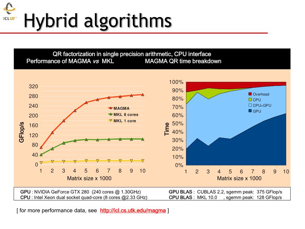 Hybrid algorithms QR factorization in single precision arithmetic, CPU interface Performance of MAGMA vs MKL MAGMA QR time breakdown Time GFlop/s Matrix size x 1000 Matrix size x 1000 GPU : NVIDIA GeForce GTX 280 (240 cores @ 1.30GHz) GPU BLAS : CUBLAS 2.2, sgemm peak: 375 GFlop/sCPU : Intel Xeon dual socket quad-core (8 cores @2.33 GHz) CPU BLAS : MKL 10.0 , sgemm peak: 128 GFlop/s [ for more performance data, see http://icl.cs.utk.edu/magma ]