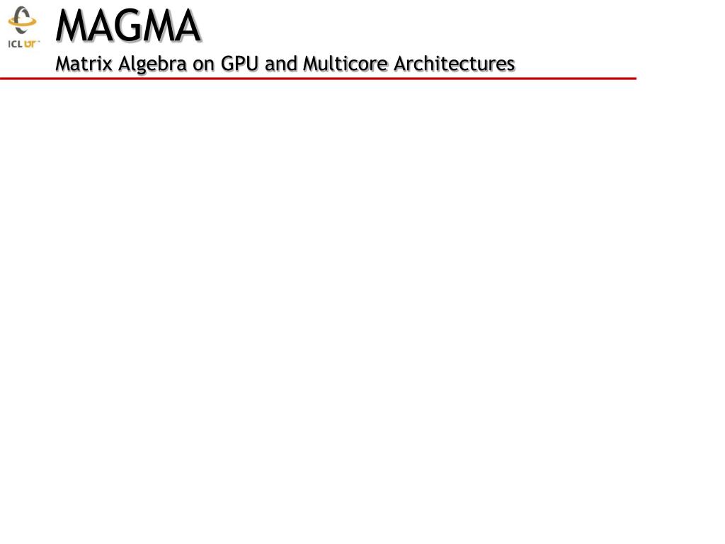 Matrix Algebra on GPU and MulticoreArchitectures (MAGMA) • MAGMA:a new generation linear algebra (LA) libraries to achieve the fastest possible time to an accurate solution on hybrid/heterogeneous architecturesHomepage:http://icl.cs.utk.edu/magma/ • MAGMA & LAPACK • MAGMA uses LAPACK and extends its functionality to hybrid systems (w/ GPUs); • MAGMA is designed to be similar to LAPACK infunctionality, data storage and interface • MAGMA leverages years of experience in developing open source LA software packages like LAPACK, ScaLAPACK, BLAS, ATLAS, and PLASMA • MAGMA developers/collaborators • U of Tennessee, Knoxville; U of California, Berkeley; U of Colorado, Denver • INRIA Bordeaux - SudOuest & INRIA Paris – Saclay, France; KAUST, Saudi Arabia • Community effort [similarly to the development of LAPACK / ScaLAPACK]