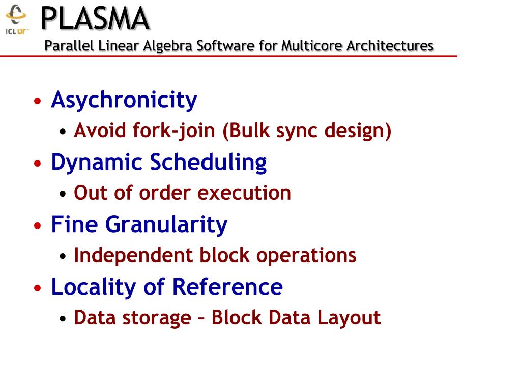 Asychronicity • Avoid fork-join (Bulk sync design) • Dynamic Scheduling • Out of order execution • Fine Granularity • Independent block operations • Locality of Reference • Data storage – Block Data Layout PLASMA Parallel Linear Algebra Software for Multicore Architectures