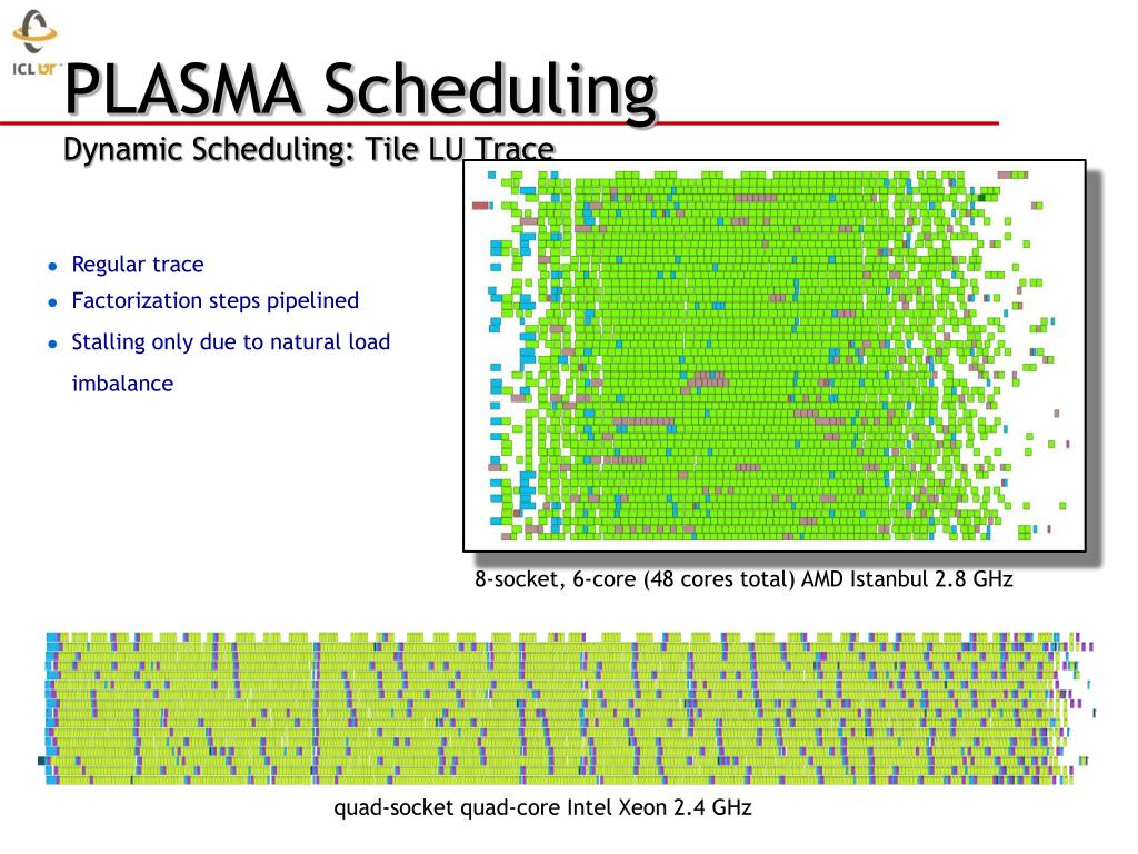 PLASMA SchedulingDynamic Scheduling: Tile LU Trace • Regular trace • Factorization steps pipelined • Stalling only due to natural load imbalance 8-socket, 6-core (48 cores total) AMD Istanbul 2.8 GHz quad-socket quad-core Intel Xeon 2.4 GHz