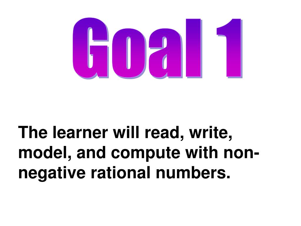 The learner will read, write, model, and compute with non-negative rational numbers. Goal 1