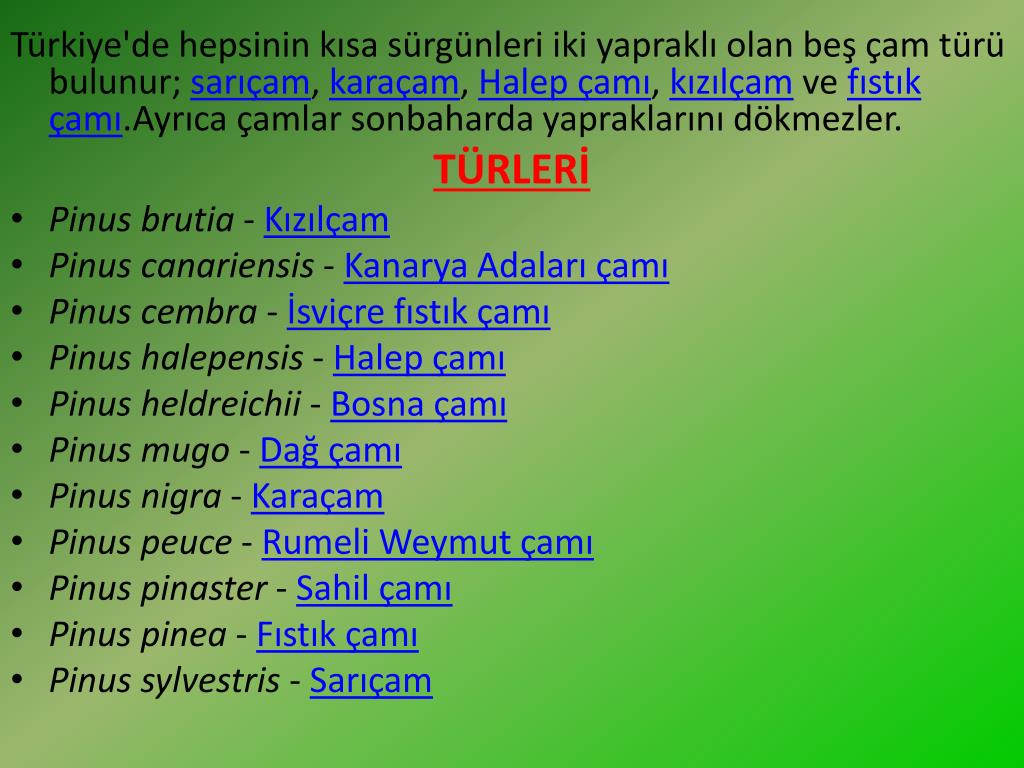 Türkiye'de hepsinin kısa sürgünleri iki yapraklı olan beş çam türü bulunur; sarıçam, karaçam, Halep çamı, kızılçam ve fıstık çamı.Ayrıca çamlar sonbaharda yapraklarını dökmezler. TÜRLERİ • Pinusbrutia - Kızılçam • Pinuscanariensis - Kanarya Adaları çamı • Pinuscembra - İsviçre fıstık çamı • Pinushalepensis - Halep çamı • Pinusheldreichii - Bosna çamı • Pinusmugo - Dağ çamı • Pinusnigra - Karaçam • Pinuspeuce - Rumeli Weymut çamı • Pinuspinaster - Sahil çamı • Pinuspinea - Fıstık çamı • Pinussylvestris - Sarıçam