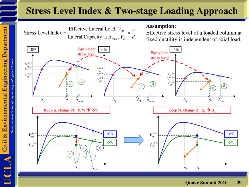 Stress Level Index & Two-stage Loading Approach 10% Equivalent stress level 0% -5% Equivalent stress level 10% -5% d d c c d d d c c c Δ1 Δmax Δy Δ1 Δy Δ1 Δy Δ1 Δmax Δmax Δmax Keep Δ, change N: 10% -5% Keep N, change Δ: Δ1 Δ2 10% -5% Δ2 Δ1 Assumption: Effective stress level of a loaded column at fixed ductility is independent of axial load.