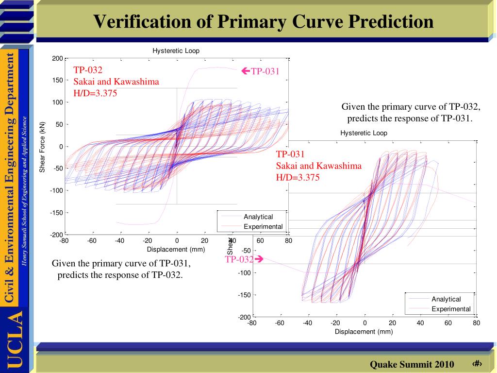 Verification of Primary Curve Prediction TP-032 Sakai and Kawashima H/D=3.375 TP-031 Given the primary curve of TP-032, predicts the response of TP-031. TP-031 Sakai and Kawashima H/D=3.375 TP-032 Given the primary curve of TP-031, predicts the response of TP-032.