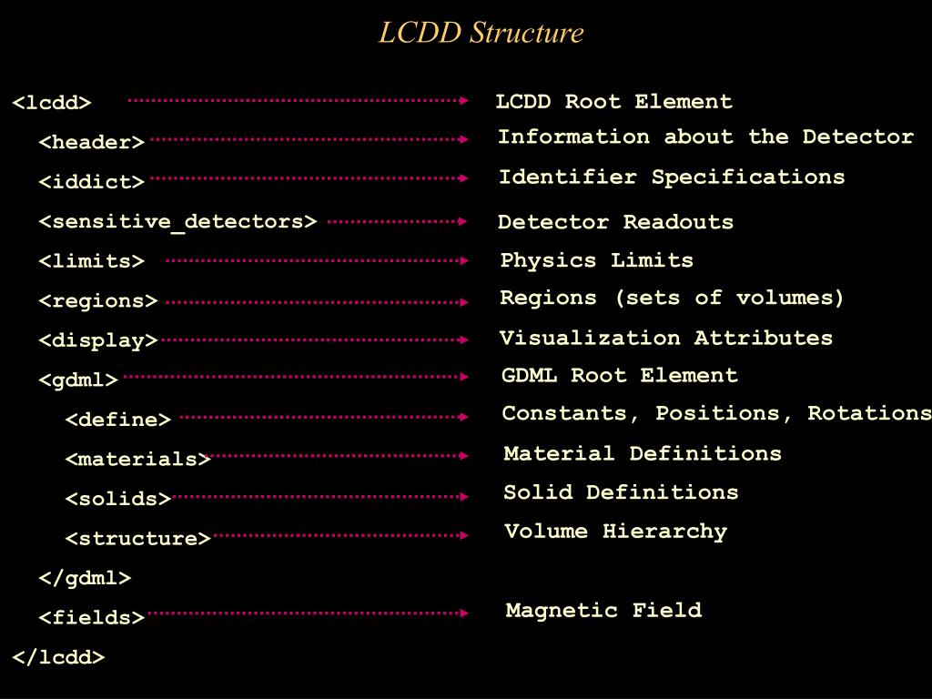 LCDD Root Element <lcdd> <header> <iddict> <sensitive_detectors> <limits> <regions> <display> <gdml> <define> <materials> <solids> <structure> </gdml> <fields> </lcdd> Information about the Detector LCDD Structure Identifier Specifications Detector Readouts Physics Limits Regions (sets of volumes) Visualization Attributes GDML Root Element Constants, Positions, Rotations Material Definitions Solid Definitions Volume Hierarchy Magnetic Field