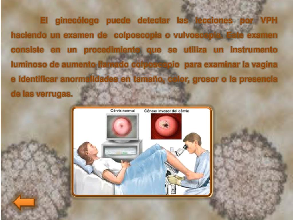 El ginecólogo puede detectar las lecciones por VPH haciendo un examen de colposcopia o vulvoscopia. Este examen consiste en un procedimiento que se utiliza un instrumento luminoso de aumento llamado colposcopio para examinar la vagina e identificar anormalidades en tamaño, color, grosor o la presencia de las verrugas.