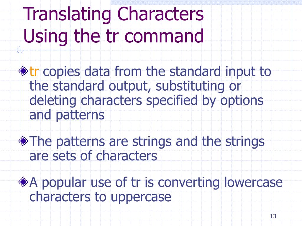 Translating CharactersUsing the tr command • tr copies data from the standard input to the standard output, substituting or deleting characters specified by options and patterns • The patterns are strings and the strings are sets of characters • A popular use of tr is converting lowercase characters to uppercase