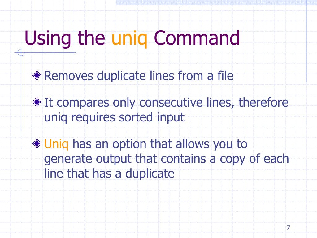 Using the uniq Command • Removes duplicate lines from a file • It compares only consecutive lines, therefore uniq requires sorted input • Uniq has an option that allows you to generate output that contains a copy of each line that has a duplicate
