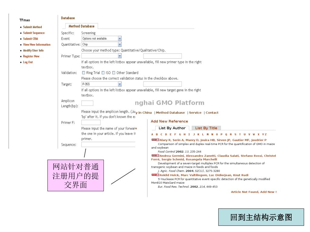 目前已基本完成,调试中 数据库已录入: 250对PCR引物信息,并进行了详尽的分类 20个内标准基因的基本信息 34条插入序列信息 30种蛋白检测方法 70条质粒信息(其中包括目前公开发表的9个标准分子) 85条标准物质信息 共涉及110篇文献 所有功能已经实现,正在调试阶段,最后界面正在完善中 筛选特异性 定性 基因特异性 核酸方法 定量 构建特异性 chip 品系特异性 数据库地址:http://202.120.45.10:7500/detect 包括公开发表文献 欧盟验证报告 国家标准、ISO标准 Zein, zssIIb, hmga, Ivr1, Adh1, lec, BnACCg8, HMG I/Y, apx, lat52, sad1, sps, gos9, oriazain, UGP, hordein, acc1, PKABA1, waxy-D1, helianthinin, cruciferin, SAH7, fsACP