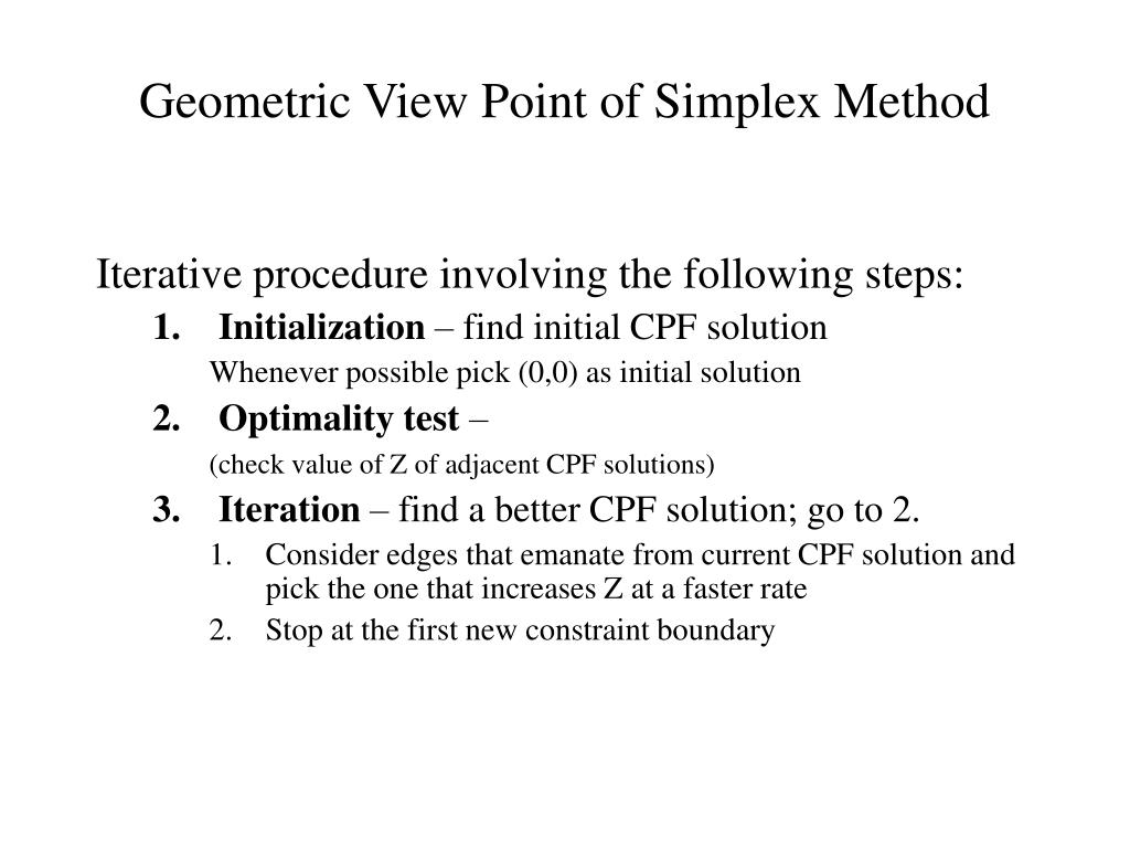 Geometric View Point of Simplex Method Iterative procedure involving the following steps: • Initialization – find initial CPF solution Whenever possible pick (0,0) as initial solution • Optimality test – (check value of Z of adjacent CPF solutions) • Iteration – find a better CPF solution; go to 2. • Consider edges that emanate from current CPF solution and pick the one that increases Z at a faster rate • Stop at the first new constraint boundary