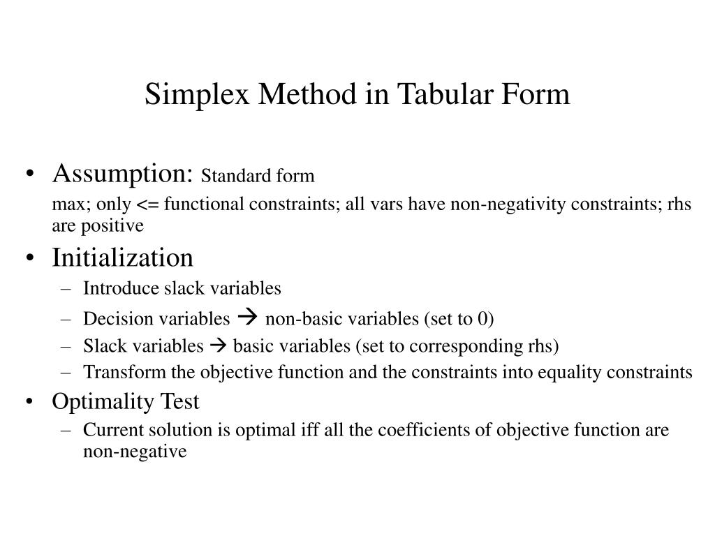 Simplex Method in Tabular Form • Assumption: Standard form max; only <= functional constraints; all vars have non-negativity constraints; rhs are positive • Initialization • Introduce slack variables • Decision variables non-basic variables (set to 0) • Slack variables basic variables (set to corresponding rhs) • Transform the objective function and the constraints into equality constraints • Optimality Test • Current solution is optimal iff all the coefficients of objective function are non-negative